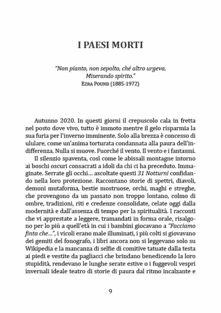 Perdersi in un bosco e imbattersi, nel cuore più tenebroso della notte, in un indemoniato… Nascosti tra selve oscure sono i terrori ancestrali. 31 racconti d’ombra, di fantasmi, lupi mannari, orchi, streghe, maghi, assassini, sedute spiritiche, possessioni, esorcismi, da leggersi all’imbrunire nelle freddi notti invernali al tepore di un camino mentre fuori urla il vento e infuria la tormenta, o nelle calde notti d’estate cantate da versi di animali dalla mole indefinita, circondati da una natura ostile e indifferente e da creature altre. 31 storie basate su fatti realmente accaduti in un mondo rurale del Sud Italia, sorta di West oscuro e orrorifico dove l’essere umano è esposto alle forze della terra e dello spazio profondo. Canti che partono dalla tradizione americana figlia di Edgar Allan Poe e H.P. Lovecraft per giungere al gotico rurale dei nostrani Carlo H. De’ Medici e Giovanni Magherini-Graziani . 31 Notturni che volano di notte, destando meraviglia e inquietudine, 31 sussurri di tenebra che una volta terminati, andandosene, nei ricordi lasceranno su questa terra la loro ombra e tanto, tanto sangue.