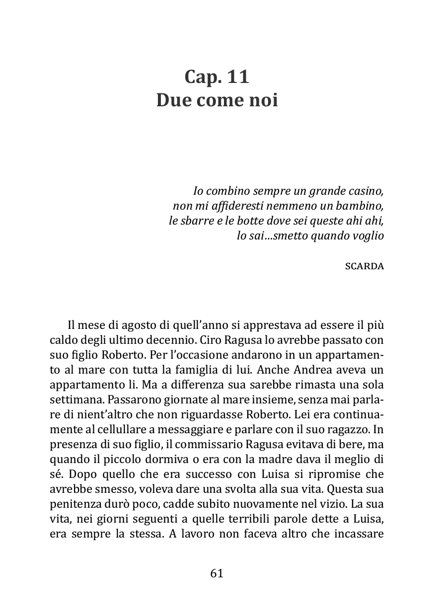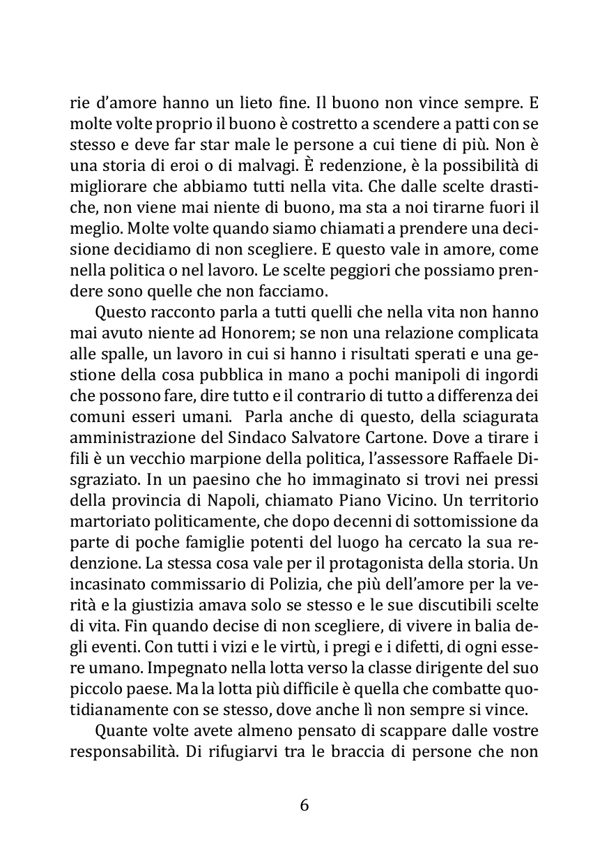 Ad Honorem più che un libro, forse, è un diario. Cinque anni dei personaggi e in particolare del protagonista, Ciro Ragusa, raccontati in 25mila parole. Come ogni diario racconta cose private, speranze e delusioni. Come si cade, ci si rialza e poi si cade di nuovo. Dove le paure hanno una fissa dimora perché esser stronzi è dono di pochi ma farlo apposta è roba da idioti. Dove le storie non hanno sempre un lieto fine, ma semplicemente una fine. Dove non vincono sempre i buoni o magari si, sta a voi decidere chi sia il buono e chi il cattivo. Ad honorem si muove su questa linea d’ombra. Una linea troppo sottile da non poter essere che oltrepassata. Dove ci sono nati vincenti e chi dalla vita ha ricevuto “ad honorem” solo sconfitte. Tutto questo in un contesto provinciale e di periferia. Nel pieno del “fan tutti così” e dove “tu da solo non puoi cambiare le cose”. Puoi andare ovunque ma quella realtà fatta di pressappochismo e ipocrisia non ti lascia andare. Impari che dalla vita non si scappa, i problemi non svaniscono staccando il cellulare o isolandosi dal mondo. Alcune volte sei costretto ad affrontarli e chi vada bene o male ti resta il fatto che ci hai provato. L’importante è che alla fine di questo romanzo tu riesca a guardarti allo specchio la mattina. Questo è Ad Honorem. Un romanzo “comunale”