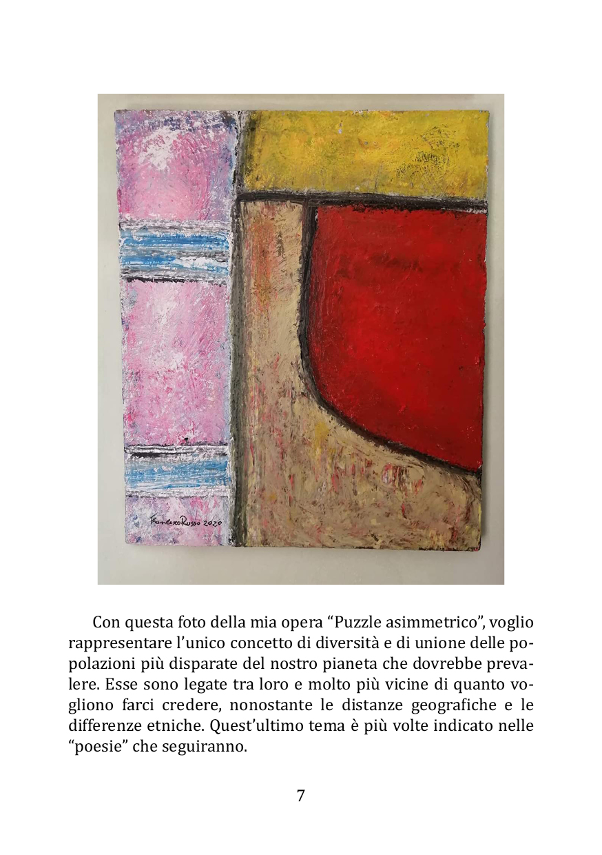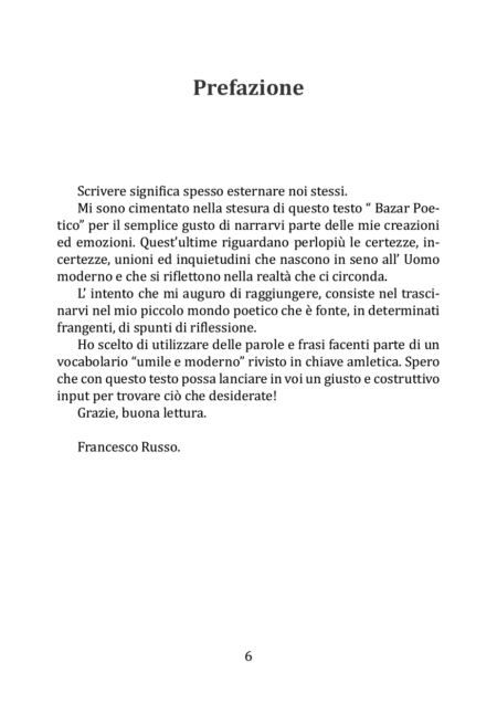 Nel testo “Bazar Poetico” lo sguardo dell’autore è rivolto alle tematiche che più ritiene necessarie argomentare in maniera creativa, quali: emozioni, relazioni umane, momenti gioiosi, momenti più bui del suo percorso personale di crescita, annichilimento della natura, crisi energetica, pandemia ,incertezza storica che sta caratterizzando questa epoca, immigrazione. Ogni suo componimento nasce da un iter fantasioso che è differente in ogni scrittore e che quindi lo caratterizza secondo una propria originalità. Molte poesie del testo sono state scritte in momenti più disparati della sua quotidianità, sono però sempre state prodotte da un dialogo interiore di tipo autentico dell’autore che grida un mondo migliore e condanna molti aspetti della società odierna. Una sua creazione intitolata “Il Passaggio” dimostra che la maggior parte di noi vive il presente non nel migliore dei modi per diverse ragioni. La prima fra tutte consisterebbe in quel mostro silenzioso che sta trasformando le nostre coscienze, secondo l’autore, facendoci sentire atavici ed incompresi rispetto alle nuove esigenze partorite dalla società moderna. Tutto ciò può soltanto generare un forte senso di incertezza per l’avvenire.”Bazar Poetico” si conclude con una sorta di racconto che impersonifica l’inquinamento e il degrado ambientale con un’entità di colore grigio, responsabile degli scempi a danno della natura.