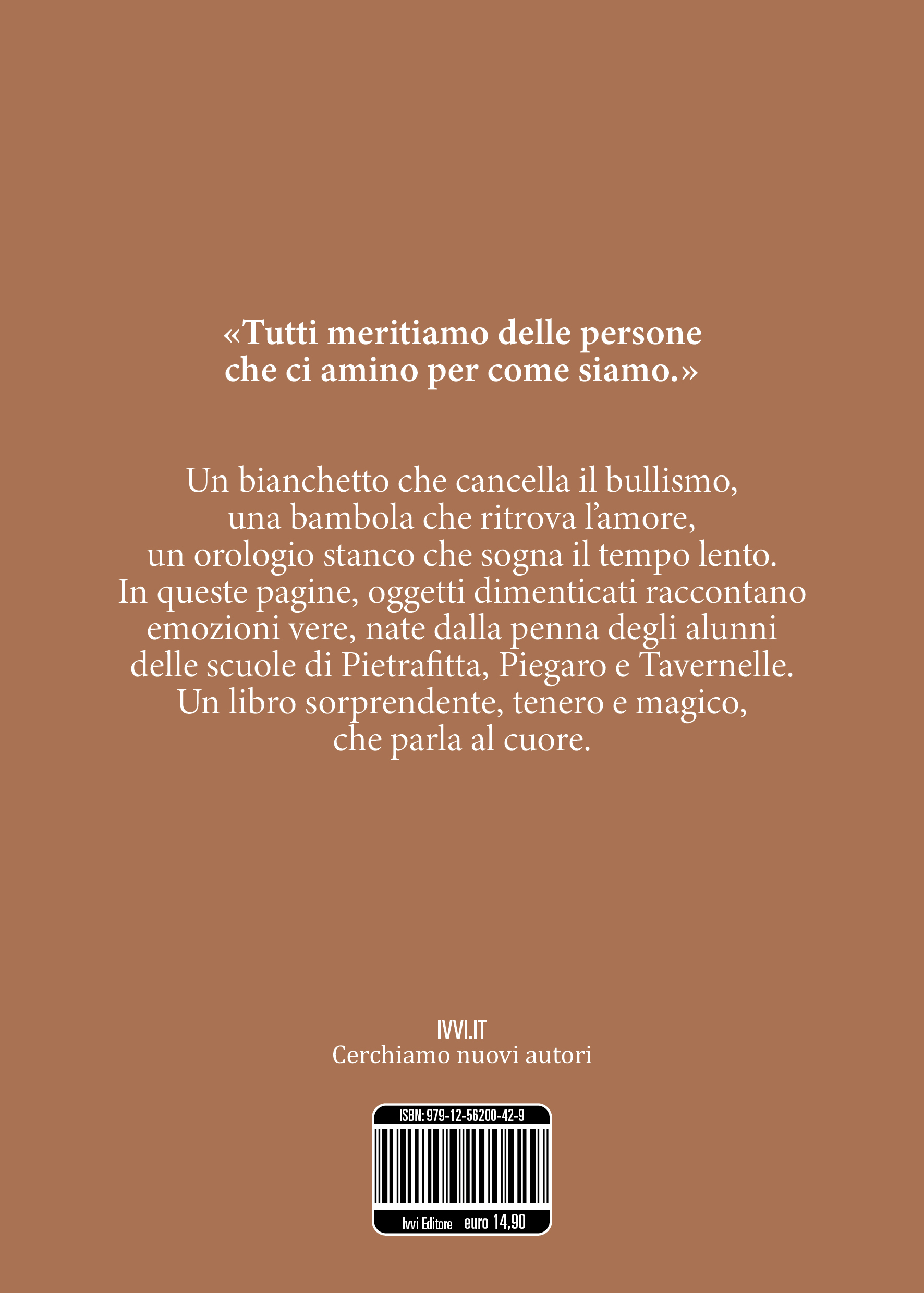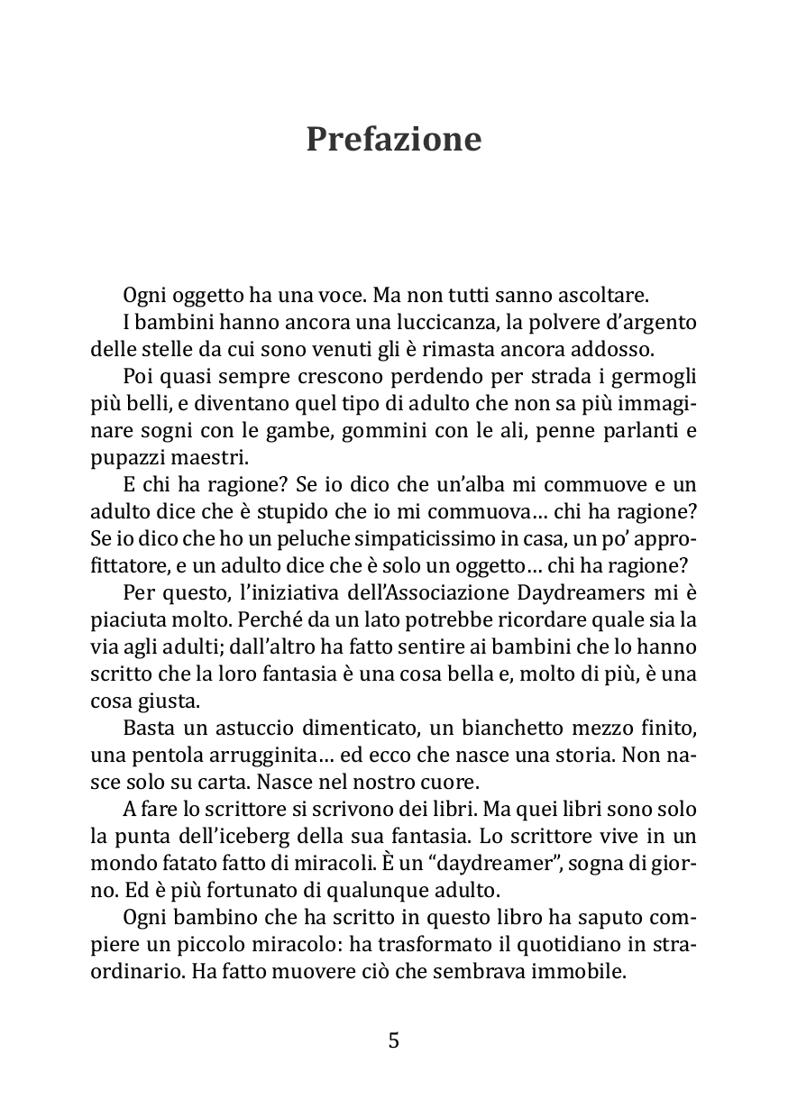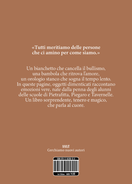 In questo libro, oggetti dimenticati prendono vita, parlano e raccontano storie sorprendenti, piene di sogni e sentimenti. Ogni racconto è nato dalla fantasia di bambini e ragazzi delle scuole primarie e secondarie di Pietrafitta, Piegaro e Tavernelle, situate nei comuni di Piegaro e Panicale. Con creatività e delicatezza, danno voce a pupazzi, penne, libri, orologi, velieri e tanti altri oggetti speciali. Ogni pagina è un invito a guardare il mondo con occhi nuovi e pieni di meraviglia. Le storie parlano di amicizia, rispetto, ecologia, coraggio, bullismo, tempo e memoria. Ogni parola è scelta con il cuore e lascia un segno. Questo libro è il frutto di un laboratorio creativo che unisce scrittura, emozione e immaginazione. Leggendolo, scoprirete che anche gli oggetti più semplici nascondono grandi avventure. E che la fantasia dei bambini è capace di accendere la magia ovunque.