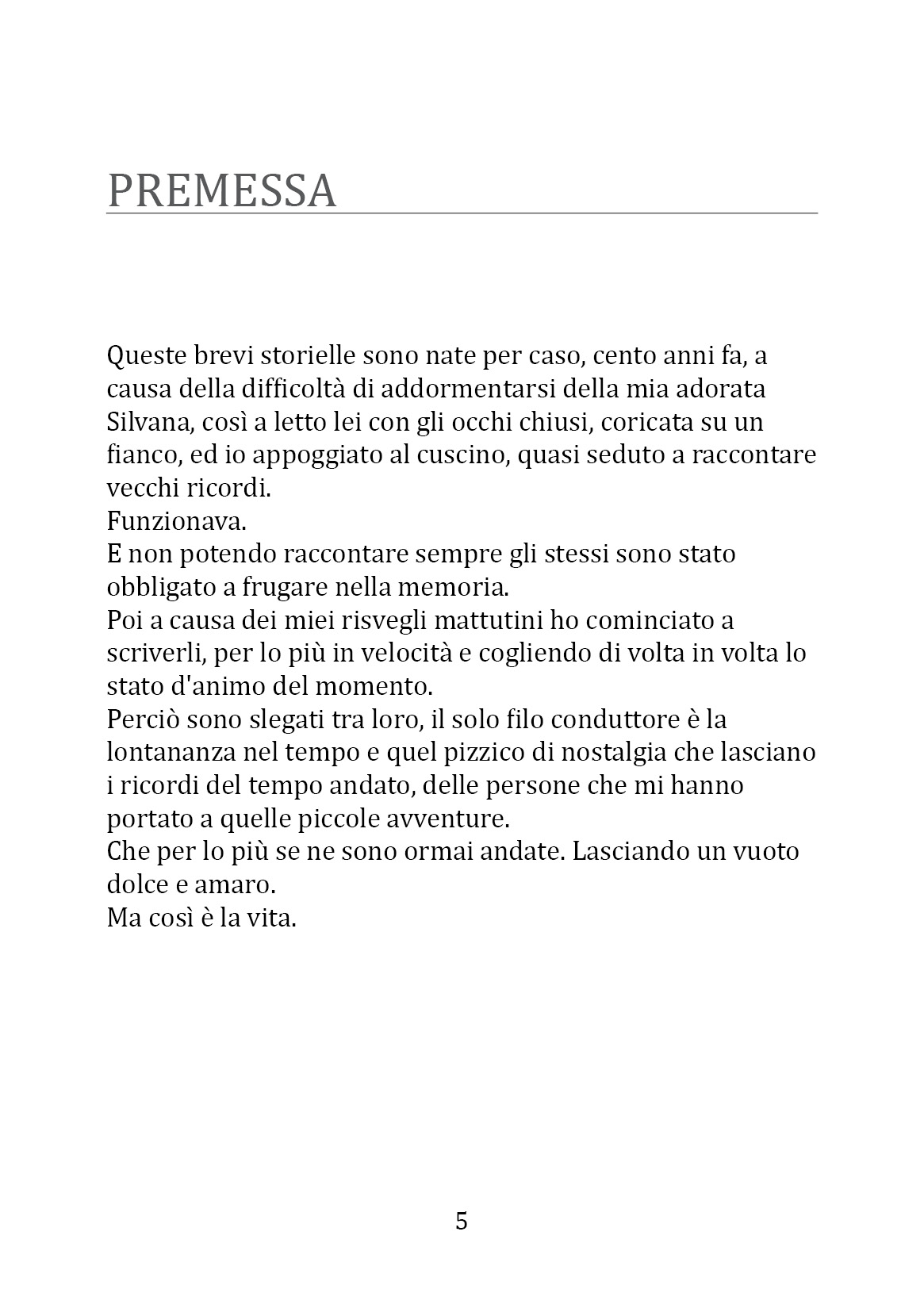 Questo libello è formato da una serie di aneddoti (“nanetti” come li chiamava Nino Frassica nella famosa trasmissione televisiva di Arbore), ricordi, pensieri sparsi, ripescati nella memoria. Non vi è un vero e proprio filo conduttore. Il denominatore comune è l’ambientazione per lo più bucolica, la lontananza nel tempo e quella dolce malinconia che certi avvenimenti lasciano nella mia mente. Praticamente sprazzi dalla fanciullezza e gioventù ormai passate.