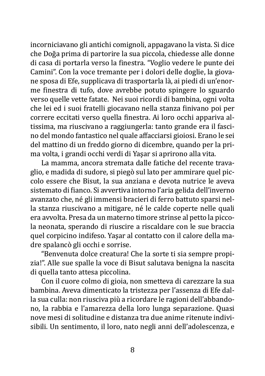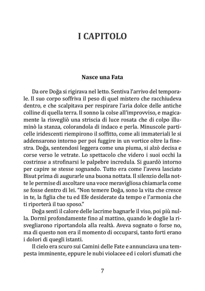 “Il cielo era scuro sui Camini delle Fate e annunciava una tempesta imminente...”. Il primo racconto si svolge nella magica Valle dei Comignoli delle Fate e narra dei misteriosi poteri della figlia di Efe, della sua fama giunta sino fino alle terre del gelo “dove non fu gradito che tanta bontà fosse riversata sulla terra”.