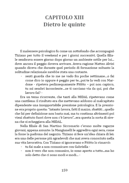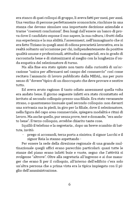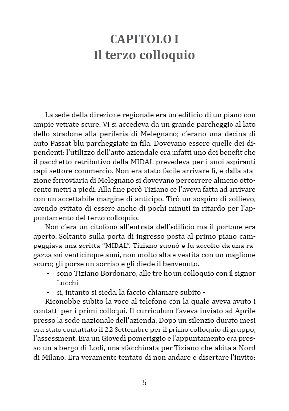Tiziano ha superato i 29 anni e nonostante si sia brillantemente laureato anni prima, non riesce ad affrancarsi dalla condizione di precarietà lavorativa. Finalmente con un contratto di lavoro “vero” in mano sente dentro di sé di poter riscuotere quel credito ideale nei confronti della vita e del mondo del lavoro che lo aveva tenuto ai margini per molto tempo. Sollevato da una situazione opprimente, celebra con sé stesso una sorta di “ritorno al mondo”. Con l’entusiasmo tipico della prima volta, non sa che sta per intraprendere un calvario. L’azienda che lo ha assunto infatti è una azienda “totalitaria”, il cui lavoro assorbe ogni spazio di vita personale e ogni altra aspirazione di vita sociale. Tiziano scopre sulla sua pelle che significa attraversare lo spartiacque tra un lavoro impegnativo ed un vero e proprio massacro fisico e mentale. La sua amarezza è anche dovuta al fatto che lui, al contrario di molti suoi amici che hanno un lavoro precario, non avrebbe nemmeno il diritto di lamentarsi. Alla fine, dopo mesi e mesi di sofferenza, si sprigiona, grazie “ad una via d’uscita” caduta un po’ dall’alto, un finale positivo e un cambio di paradigma mentale per Tiziano. Il giovane riacquista un’umanità e la dignità minacciate da un’aberrante organizzazione che ha tentato di distruggere Tiziano e tanti altri giovani ricattati da deboli (se non inesistenti) prospettive di futuro.