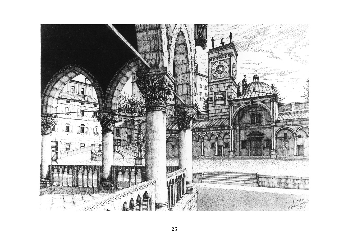Perché, pur essendo ritenuto il “padre delle tre arti nostre, architettura, scultura e pittura” (1), il disegno, per molti secoli, è stato considerato quasi esclusivamente alla stregua di una tecnica preparatoria per la pittura e per le altre arti, una sorta di stadio provvisorio di un processo che si conclude con il completamento dell'opera definitiva. […] È necessario attendere la seconda metà dell'ottocento, nei decenni delle grandi trasformazioni del mondo, per leggere la voce chiara e libera di Charles Baudelaire il quale, con un colpo di rasoio, riesce a dividere le dessin des coloristes (il disegno per i pittori e per gli artisti in genere) da le dessin des dessinateurs, contribuendo a riscattare il disegno dall'antico servaggio e, finalmente, conferire al disegno la dignità di arte indipendente. […] Erasmo Frascaroli possiede tutte queste virtù e si esprime con la sua indole di geografo, che osserva e che attraversa il micro e il macro, come formica e come uccello, per contare le briciole della terra e per imparare il cielo, per misurare il quale bisogna avere le seste negli occhi. Non inventa una nuova realtà sognante e mai esistita ma riproduce il reale ingrandendone le originarie dimensioni o riducendolo a miniatura e, utilizzando pennini di varie fogge e pennelli appuntiti e gentili, esprime l'amore che prova per ciò che viene rappresentato, ricordo di un tempo passato o resto di una emozione che riprende vita; ubbidisce alle regole della copia perfetta e mostra nel suo fare l'esercizio continuo del disegno e la perseveranza che conferma l'antico adagio: nulla dies sine linea.