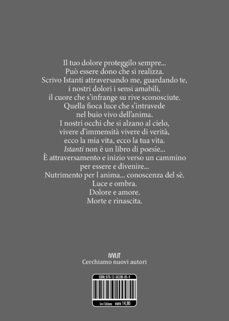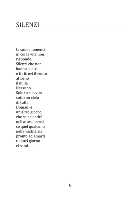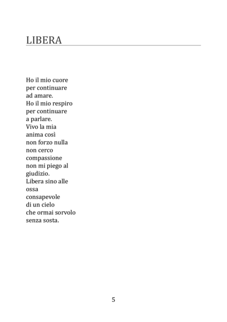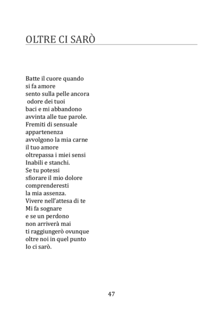 Nella poesia di Rosaria Chiarello non c'è metrica né rima, non esistono regole. Parole che scorrono fluide attraverso l’anima, sinossi di una vita ferma nel cuore e sulla sua pelle, cicatrici che le fanno ancora male. Si legge nella sua poesia il ponte del dolore “fossilizzato” che realizza in sogni e nella sola fonte ed unico suo fulcro di vita... l'amore. Nuda e senza vergogna, descrive le sue emozioni, sentimenti reali che si inoltrano dentro parole di verità, miseria umana e speranza. La sua poesia evidenzia il superfluo e ciò che manca. Il tutto e il niente. Il ritrovarsi sempre, morte e rinascita di quell’istante oltre la vita stessa.