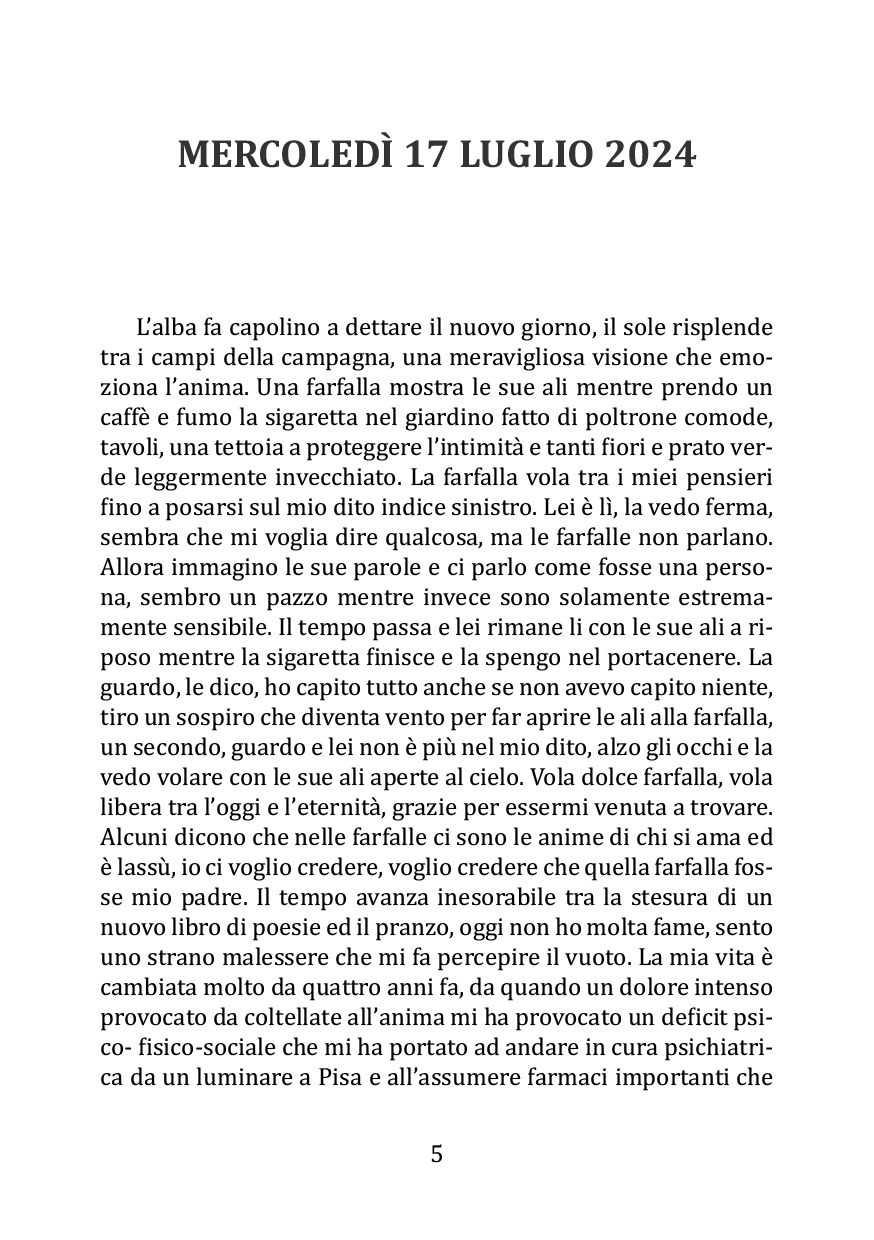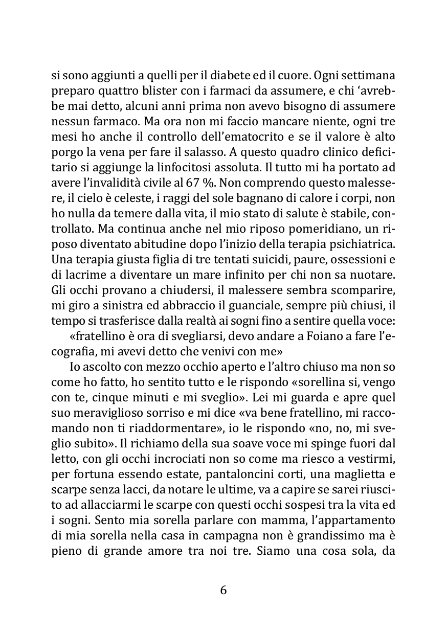 «L’amore tra le parole, una tempesta vestita di dolore che colpisce il cuore e lo rende incanto verso una donna meravigliosa. Una malattia, un minuto, parole che ti cambiano la vita e poi il viaggio, un cammino nella vita e con la vita, tra speranza e disperazione, tra luce e buio ed il suo contrario. Buona lettura.»