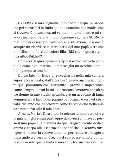 Iris vive tra sogno e realtà, ma la sottile linea di confine svanisce e lei non è più in grado di riconoscere quello che realmente è il suo mondo da quelle che sono le sue speranze e i suoi sogni in cui amore, famiglia e serenità si conciliano perfettamente.Un romanzo in cui la protagonista affronta un viaggio temporale confuso che la porta a vivere la vita che realmente vorrebbe. Il percorso di Iris ha inizio con una trasferta in Grecia, regalo delle sue amiche, per andare a far visita alla propria madre; da quel momento, la nostra protagonista troverà sé stessa e la felicità sempre desiderata. Ovelpo significa sogno e questo vuole essere il punto centrale della storia: vivere la vita come in un sogno e perché no, continuare a sognare, d’altronde con i sogni spesso si superano realtà meno rosee e con la lettura viene permesso anche a te, cara lettrice, di sognare e continuare a sperare.