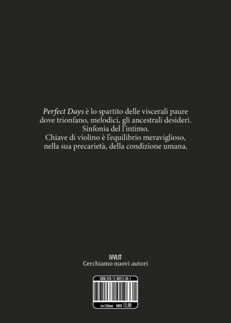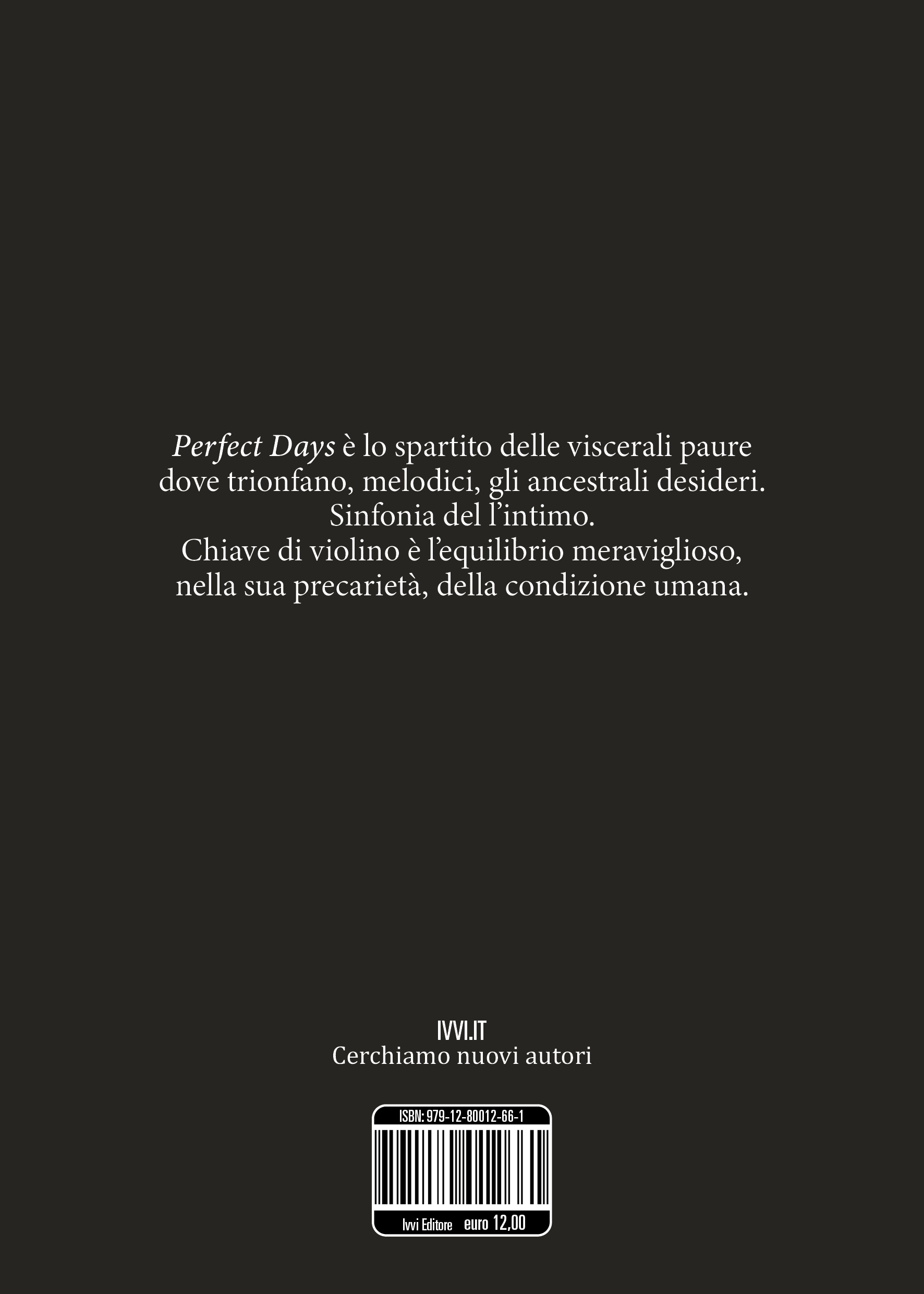 “Perfect Days” è il palco dove si rivela la vita di Walter: vita che corre seguendo con costanza la musica rock, che si fa portatrice di energie nuove, di pulsioni rinfrancate, stimolo verso il domani e ovattato ostacolo della malinconia. Con la musica anche la vita di Walter va avanti, tra viaggi e amicizie, flirt e amori, sino all’abbandono da parte di Caterina e al sogno conclusivo, levigato come il profilo del monte Conero, in cui Walter rivede sua madre; verso una rinascita che inizia dal mettere da parte, come una sorta di distante conservazione, tutti i sentimenti, attuali e passati, rivolti a Caterina, per proseguire lungo una serie di ritrovati “perfect days”. Perfect Days nasce dai versi di David Bowie e Freddie Mercury per concludersi con l’istante, il giorno perfetto cantato dall’eterno leader dei Velvet Underground, Lou Reed. Nel mezzo si alterneranno brani leggendari e fondamentali vicende private dei protagonisti. Il viaggio sarà mezzo di crescita, maturazione, presa di coscienza. Milano, la certezza, la modernità, il corpo perfetto verrà abbandonato per raggiungere il cuore pulsante del centro Italia: claudicante, misterioso, macchinoso eppur bagnato di quella magia che Milano non potrà mai ottenere. Perdersi per ritrovarsi o forse perdersi per trovarsi davvero per la prima volta. Le Marche recitano un ruolo da protagonista e si mostreranno senza veli: agrodolci, sanguinanti, ferite dal recente terremoto del 2016 che le devastò. Perfect Days è lo spartito delle viscerali paure dove trionfano, melodici, gli ancestrali desideri. Sinfonia dell’intimo. Chiave di violino è l’equilibrio meraviglioso, nella sua precarietà, della condizione umana.