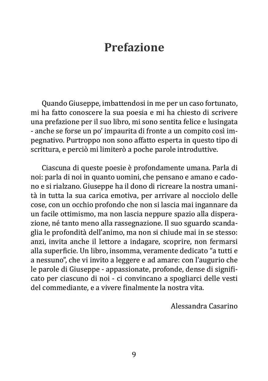 Ciò fa di quest’Opera non una sintesi, ma una breve pausa, un punto di arrivo in un respiro profondo, una fotografia sbiadita nei colori del tempo ai nostri tempi, un manifesto senza data scritto da un uomo che si guarda in punta di piedi, che osserva e guarda scandagliando il proprio animo in punta di piedi, senza chiudersi a riccio verso se stesso, lo specchio verso il proprio comportamento negli altri, nel suo scorrere della vita, nel vedersi come in una stagione, nei suoi colori, nelle sue sfumature, nei suoi orizzonti.