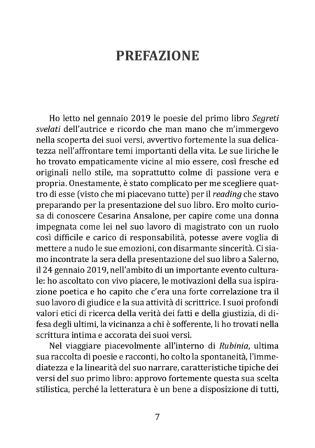 Rubinia è un libro double face, una silloge poetica e di racconti che raccoglie “i disagi e i dialoghi dell’anima di ieri e di oggi del poeta” e “ospita” percorsi di un viaggio contemplativo dell’esistenza, nella consapevolezza che frammenti di “ricordi, veli di malinconie, profondità dello spirito, luci e ombre, speranze e illusioni, parole dette o non dette” sono sostanza autentica della natura umana. Anche nel più profondo degli abissi, la poesia conduce “all’armonia” dell’anima e “svela un percorso alternativo dell’esistenza”, che, seppure frastagliato, orienta anche nelle notti senza luna. Il poeta difficilmente si spoglia dei suoi vestiti, tanto trasparenti da mostrare le ossa e la linfa del cuore, bagnati da lacrime ancestrali e sporchi del sudore del male del mondo, ma in Rubinia si spoglia, ”lascia per terra i suoi vestiti” e “si riveste” dei panni assai variopinti dell’autore di racconti brevi, un tempo chiamati “novelle” per rappresentare “Storie di donne”. Un viaggio dove “tutto si fa amore” e Adelina, Sara, Giorgia, Valentina e Aisha, in una narrativa commovente che evoca immagini nitide, in una piccola ma immensa storia, raccontano sentimenti umani e labili.