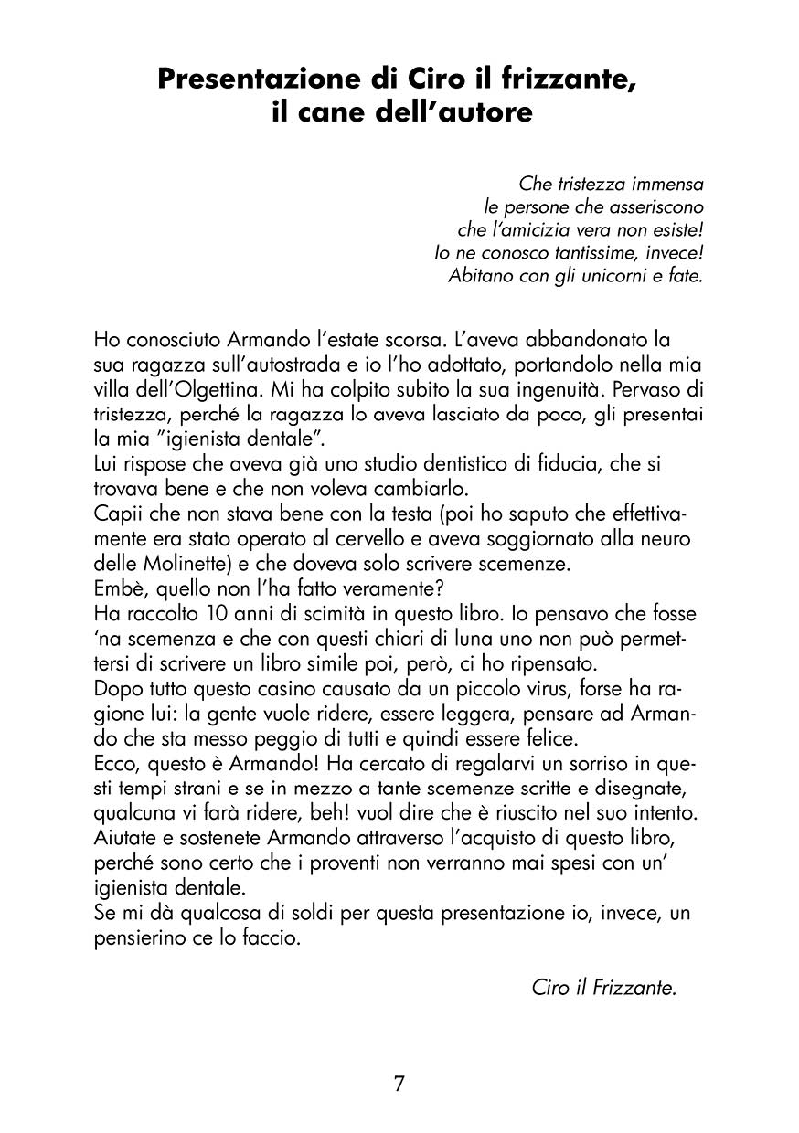 Aiutate e sostenete Armando attraverso l’acquisto di questo libro, perché sono certo che i proventi non verranno mai spesi con un’ igienista dentale. Se mi dà qualcosa di soldi per questa presentazione io, invece, un pensierino ce lo faccio.”