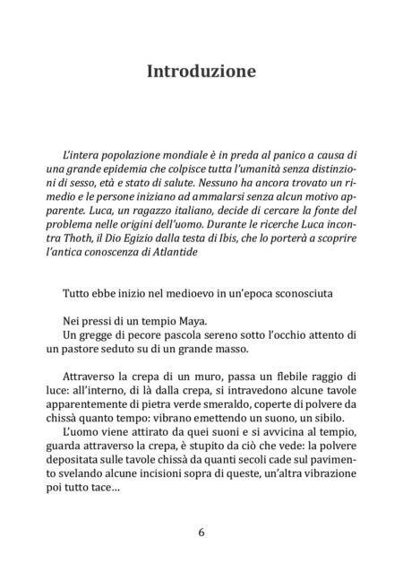 L’intera popolazione mondiale scivola nel caos, compiendo disordini e atti come quelli di cui parlano abitualmente i telegiornali. La causa di questi disordini non si comprende ancora, ma le case farmaceutiche fiutano l’affare e immettono sul mercato un farmaco privo di qualsiasi effetto. Luca, il protagonista della storia, perde un suo caro amico, e questo sarà l’elemento scatenante della sua avventura. Si metterà alla ricerca della causa che ha scatenato tutto e le sue ricerche, il suo desiderio di trovare una spiegazione, lo porteranno in giro per il mondo a trovare delle risposte che la società moderna ancora non riesce ad accettare. Durante il suo percorso di vita, il Dio Thoth inizia lentamente a comunicare con Luca e a svelargli il contenuto delle tavole smeraldine, volendo portare ancora una volta nella coscienza degli uomini, le antiche conoscenze. Luca per puro caso incontra Angela, una figura genuina, di cui Luca si innamora quasi a prima vista, e sarà lei a sostenere per prima le teorie e le crisi di Luca.