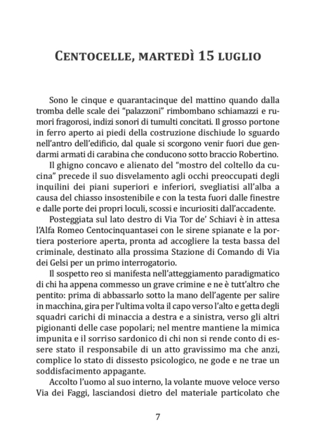 La vicenda si svolge nell’estate di un anno indefinito ed è ambientata nel cosiddetto “quadrivio della morte”, ossia l’incrocio tra quattro strade del quartiere Prenestino XIX, nella periferia di Roma: Via delle Palme, Via Tor de’ Schiavi, Via Prenestina e Via Casilina. Si tratta di una area urbana, quella di Centocelle, caratterizzata da sempre dal degrado, dalla povertà e dalla presenza della grande e piccola criminalità, organizzata e indipendente. In un tempo ed in un luogo limitati, confacenti alle unità aristoteliche (della tragedia) di tempo e spazio, si muovono per le vie della borgata alcuni personaggi uniti dalla stessa esigenza: la ricerca della tranquillità. Quest’ultima è stata minata, per ognuno di loro, da alcuni eventi traumatici del passato e da patologie psicotiche da cui sono affetti. La ninfomania, ad esempio, non permette a Patrizia, moglie del rupofobico Carlo, di vivere serenamente la propria sessualità; il ricordo, legato agli anni della Grande Guerra, di una creatura misteriosa e abominevole, turba la quotidianità di Mirella, moglie del barbiere Enzo Corelli, e così via. Gli episodi di violenza, di morte e di mistero a cui assisteranno gli abitanti della borgata in due giorni, renderanno Centocelle un luogo desolato ed irriconoscibile rispetto al passato.